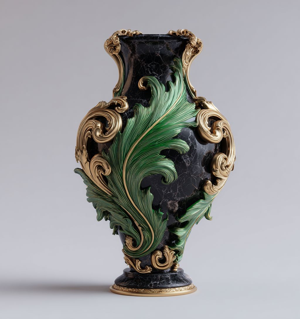 The base would be carved or cast from black marble (or a high-quality composite for cost efficiency). The gold scrollwork could be cast bronze with gold plating, attached separately. The green leaves would be hand-painted enamel or possibly inlaid malachite for a luxury version.