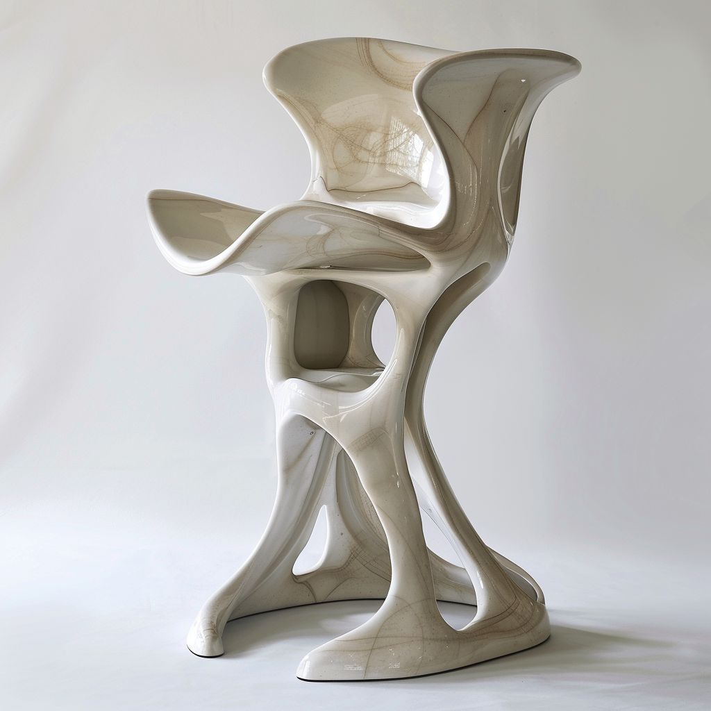 A sculptural bar-height chair in glossy white fiberglass. The form is entirely organic—flowing curves, negative spaces, and interconnected supports that resemble bones or branches. The backrest sweeps up and outward like a wave frozen mid-crash. Subtle cream marbling runs through the finish.